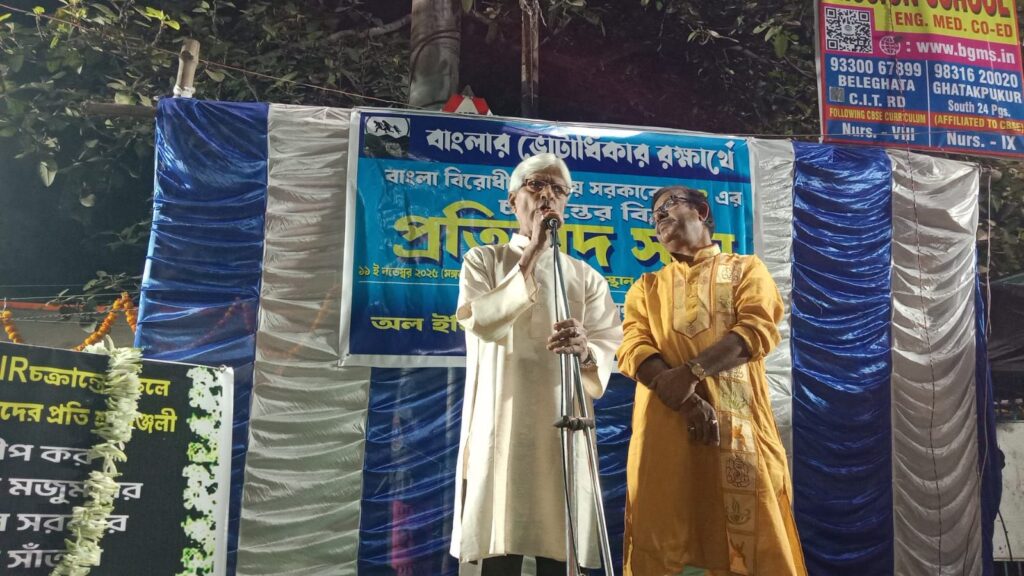 আপডেট প্রতিদিন,বেবি চক্রবর্ত্তী ১১নভেম্বর:কলকাতা:- বাংলার ভোটাধিকার রক্ষা ও বাংলা-বিরোধী কেন্দ্রের এস.আই.আর (SIR) নীতির তীব্র প্রতিবাদে অল ইন্ডিয়া উদ্ভাস্তু উন্নয়ন সমিতির উদ্যোগে আজ উত্তর কলকাতার খাস এলাকায় এক বিশাল প্রতিবাদ সভার আয়োজন করা হয়। পাশাপাশি এই সভা শুরু হয় শহীদদের স্মৃতির উদ্দেশ্যে এক মিনিটের নীরবতা পালনের মধ্য দিয়ে।